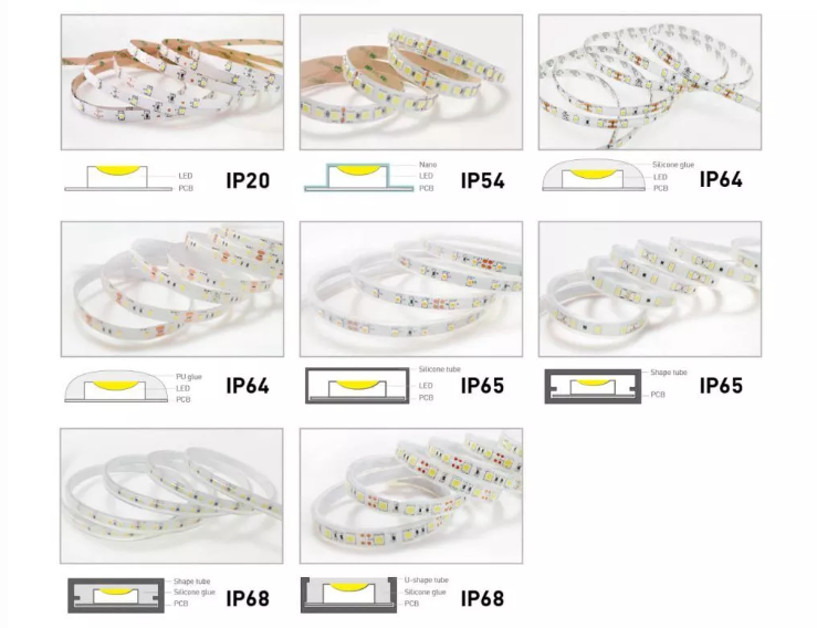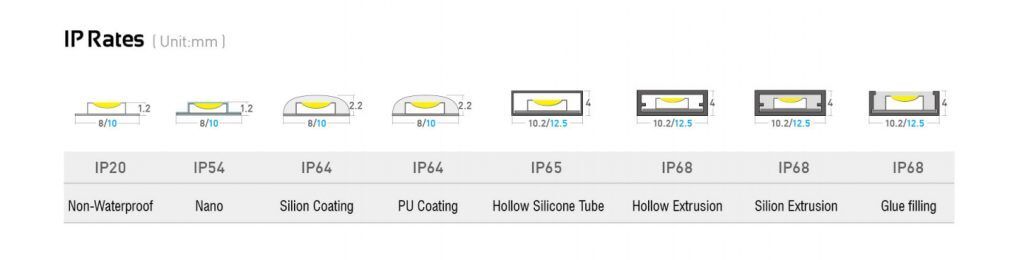 以下是 LED 燈條的不同 IP 等級及其防液體和防塵能力。它會讓您了解哪種 IP 等級 LED 燈條適合您的需求。